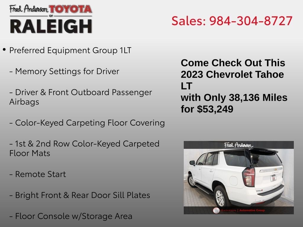 CARFAX One-Owner. *Full Family Plan* INCLUDES OIL CHANGES FOR LIFE!, Still Under Factory Powertrain Warranty!!, Only One Prior Owner!!, Alloy wheels / Premium Wheels, Bluetooth, Hands-Free, Leather Seats, 3rd Row Seats, Local Trade, Star Safety System with Active Breaking Technologies, Keyless Entry, Keyless Start, Backup Camera, Sunroof / Panoramic Roof, Trailer Hitch, We will buy your car and pay top dollar for it, even if you don't buy ours!!, USB Port, 4WD, Jet Black w/Leather-Appointed Seat Trim, 1st & 2nd Row Color-Keyed Carpeted Floor Mats, Auto-Dimming Inside Rear-View Mirror, Bose 9-Speaker Stereo Audio System Feature, Bright Front & Rear Door Sill Plates, Color-Keyed Carpeting Floor Covering, Driver & Front Outboard Passenger Airbags, Enhanced Driver Information Center, Floor Console w/Storage Area, Hands-Free Rear Power Programmable Liftgate, Infotainment Display, LED Daytime Running Lamps, Memory Settings for Driver, Preferred Equipment Group 1LT, Remote Start, SiriusXM Radio w/360L, Universal Home Remote, Wireless Charging, Wrapped Steering Wheel. Odometer is 14915 miles below market average! Check out all these great options Preferred Equipment Group 1LT (1st & 2nd Row Color-Keyed Carpeted Floor Mats, Auto-Dimming Inside Rear-View Mirror, Bose 9-Speaker Stereo Audio System Feature, Bright Front & Rear Door Sill Plates, Color-Keyed Carpeting Floor Covering, Driver & Front Outboard Passenger Airbags, Enhanced Driver Information Center, Floor Console w/Storage Area, Hands-Free Rear Power Programmable Liftgate, Infotainment Display, LED Daytime Running Lamps, Memory Settings for Driver, Remote Start, SiriusXM Radio w/360L, Universal Home Remote, Wireless Charging, and Wrapped Steering Wheel), 4WD, Jet Black w/Leather-Appointed Seat Trim, 10-Way Power Driver & Passenger Seat Adjusters, 2nd Row Manual Bucket Seats, 3.23 Rear Axle Ratio, 3rd row seats: split-bench, 4-Wheel Disc Brakes, 9 Speakers, ABS brakes, Air Conditioning, Alloy wheels, AM/FM radio: SiriusXM with 360L, Apple CarPlay/Android Auto, Auto High-beam Headlights, Auto-dimming Rear-View mirror, Automatic temperature control, Brake assist, Bumpers: body-color, Compass, Delay-off headlights, Driver door bin, Driver vanity mirror, Dual front impact airbags, Dual front side impact airbags, Dual-Pane Power Panoramic Sunroof, Electronic Stability Control, Emergency communication system: OnStar and Chevrolet connected services capable, Four wheel independent suspension, Front anti-roll bar, Front Bucket Seats, Front Center Armrest, Front dual zone A/C, Front High-Back Reclining Bucket Seats, Front reading lights, Fully automatic headlights, Garage door transmitter, Heated door mirrors, Heated Driver & Front Passenger Seats, Heated front seats, Illuminated entry, Leather-Appointed Seat Trim, Low tire pressure warning, Memory seat, Navigation System, Occupant sensing airbag, Outside temperature display, Overhead airbag, Overhead console, Panic alarm, Passenger door bin, Passenger vanity mirror, Power door mirrors, Power driver seat, Power Liftgate, Power passenger seat, Power steering, Power windows, Premium audio system: Chevrolet Infotainment 3 Premium, Premium Smooth Ride Suspension, Radio: Chevrolet Infotainment 3 Premium System, Rain sensing wipers, Rear air conditioning, Rear anti-roll bar, Rear reading lights, Rear seat center armrest, Rear window defroster, Rear window wiper, Remote keyless entry, Roof rack: rails only, Security system, Speed control, Speed-sensing steering, Split folding rear seat, Spoiler, Steering wheel mounted audio controls, Tachometer, Telescoping steering wheel, Tilt steering wheel, Traction control, Trip computer, Variably intermittent wipers, Voltmeter, and Wheels: 18" x 8.5" Bright Silver Painted AluminumStop by and test drive today. Let us show you how affordable we can make it. Remember, we always give you more for your trade and we will buy your vehicle even if you don't buy one from us. See online @ www.FredAndersonToyota.com o