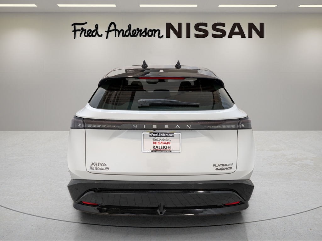 Check out all these great options Navigation system: Nissan Door to Door Connected Navigation, Power Liftgate, Power moonroof, 10 Speakers, 20" Alloy Wheels, 4-Wheel Disc Brakes, 8.896/7.679 Final Drive Ratio, ABS brakes, Air Conditioning, Alloy wheels, AM/FM radio: SiriusXM, Auto High-beam Headlights, Automatic temperature control, Black Painted Splash Guards, Brake assist, Bumpers: body-color, Carpeted Floor Mats & First Aid Kit, Delay-off headlights, Driver door bin, Driver vanity mirror, Dual front impact airbags, Dual front side impact airbags, Electronic Stability Control, Emergency communication system: NissanConnect EV & Services, Exterior Ground Lighting, Four wheel independent suspension, Front anti-roll bar, Front Bucket Seats, Front Center Armrest, Front dual zone A/C, Front fog lights, Front reading lights, Garage door transmitter: HomeLink, Heads-Up Display, Heated & Cooled Front Bucket Seats, Heated door mirrors, Heated front seats, Heated rear seats, Heated steering wheel, Illuminated entry, Illuminated Kick Plates, Knee airbag, Leather steering wheel, Low tire pressure warning, Memory seat, Nappa Leather Seating Surfaces, Occupant sensing airbag, Outside temperature display, Overhead airbag, Panic alarm, Passenger door bin, Passenger vanity mirror, Power door mirrors, Power driver seat, Power passenger seat, Power steering, Power windows, Radio: Bose Premium Audio System w/AM/FM, Rain sensing wipers, Rear anti-roll bar, Rear reading lights, Rear seat center armrest, Rear side impact airbag, Rear window defroster, Rear window wiper, Remote keyless entry, Security system, Speed control, Speed-sensing steering, Speed-Sensitive Wipers, Split folding rear seat, Spoiler, Steering wheel memory, Steering wheel mounted audio controls, Telescoping steering wheel, Tilt steering wheel, Traction control, Trip computer, Turn signal indicator mirrors, Variably intermittent wipers, and Ventilated front seats *** AVAILABLE AT FRED ANDERSON NISSAN OF RALEIGH. CALL US NOW 919-787-0254*** Nissan Ariya Everest White Pearl Tricoat/Black Diamond Pearl PLATINUM+ e-4ORCE AWD CVT Electric Motor