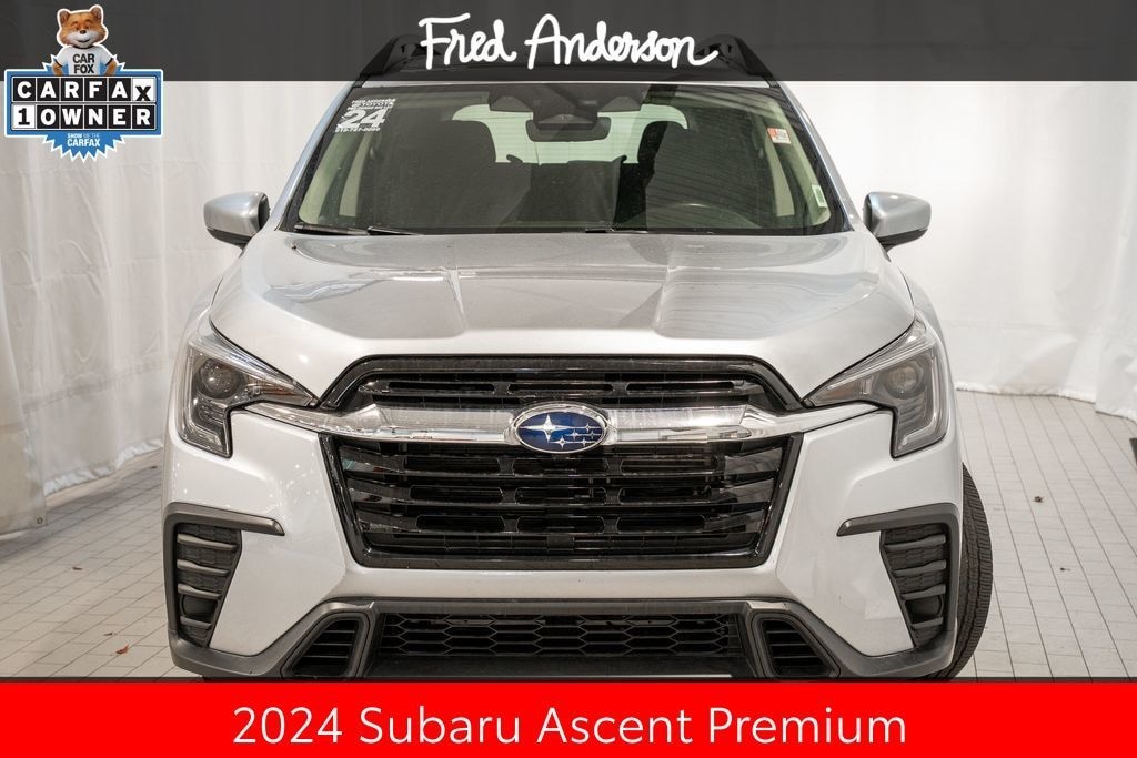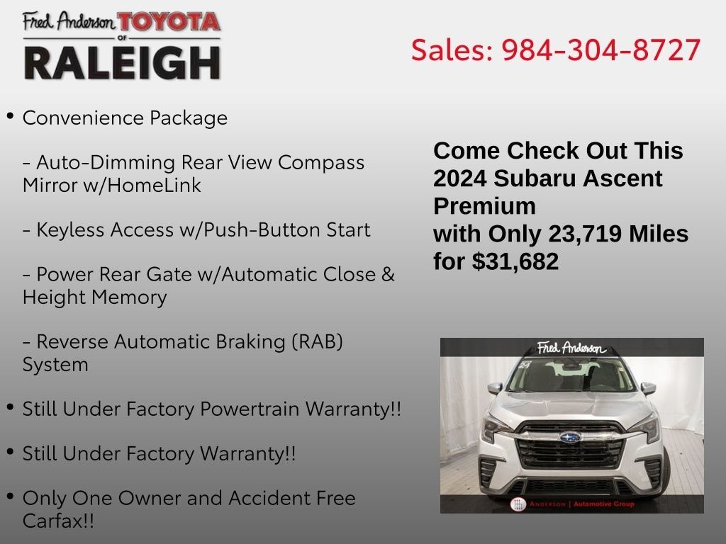 CARFAX One-Owner. Clean CARFAX. Priced below KBB Fair Purchase Price! Still Under Factory Powertrain Warranty!!, Still Under Factory Warranty!!, Only One Owner and Accident Free Carfax!!, Alloy wheels / Premium Wheels, Bluetooth, Hands-Free, Local Trade, Star Safety System with Active Breaking Technologies, Keyless Entry, Keyless Start, Backup Camera, We will buy your car and pay top dollar for it, even if you don't buy ours!!, USB Port, Auto-Dimming Rear View Compass Mirror w/HomeLink, Convenience Package, Keyless Access w/Push-Button Start, Power Rear Gate w/Automatic Close & Height Memory, Reverse Automatic Braking (RAB) System. Check out all these great options Convenience Package (Auto-Dimming Rear View Compass Mirror w/HomeLink, Keyless Access w/Push-Button Start, Power Rear Gate w/Automatic Close & Height Memory, and Reverse Automatic Braking (RAB) System), 3rd row seats: bench, 4-Wheel Disc Brakes, 6 Speakers, ABS brakes, Air Conditioning, Alloy wheels, AM/FM radio: SiriusXM, Auto High-beam Headlights, Automatic temperature control, Axle Ratio: 4.44, Brake assist, Bumpers: body-color, Delay-off headlights, Driver door bin, Driver vanity mirror, Dual front impact airbags, Dual front side impact airbags, Electronic Stability Control, Emergency communication system: STARLINK Safety and Security (Subscription Required), Exterior Parking Camera Rear, Four wheel independent suspension, Front anti-roll bar, Front Bucket Seats, Front Center Armrest, Front dual zone A/C, Front reading lights, Fully automatic headlights, Heated door mirrors, Heated Front Bucket Seats, Heated front seats, Illuminated entry, Knee airbag, Leather Shift Knob, Leather steering wheel, Low tire pressure warning, Occupant sensing airbag, Outside temperature display, Overhead airbag, Overhead console, Panic alarm, Passenger door bin, Passenger vanity mirror, Power door mirrors, Power driver seat, Power steering, Power windows, Radio data system, Radio: Subaru STARLINK 11.6" Multimedia Plus System, Rear air conditioning, Rear anti-roll bar, Rear reading lights, Rear window defroster, Rear window wiper, Reclining 3rd row seat, Remote keyless entry, Security system, Speed control, Speed-sensing steering, Spill Resistant Coated Cloth Upholstery, Split folding rear seat, Spoiler, STARLINK/Apple CarPlay/Android Auto, Steering wheel mounted audio controls, Tachometer, Telescoping steering wheel, Tilt steering wheel, Traction control, Trip computer, Turn signal indicator mirrors, Variably intermittent wipers, and Wheels: 18" x 7.5 J Gray Alloy w/Machine FinishStop by and test drive today. Let us show you how affordable we can make it. Remember, we always give you more for your trade and we will buy your vehicle even if you don't buy one from us. See online @ www.FredAndersonToyota.com or see in person @ Fred Anderson Toyota 9101 Glenwood Ave. Raleigh NC, 27617. 2024 Subaru Ascent Premium AWD Ice Silver Metallic Lineartronic CVT